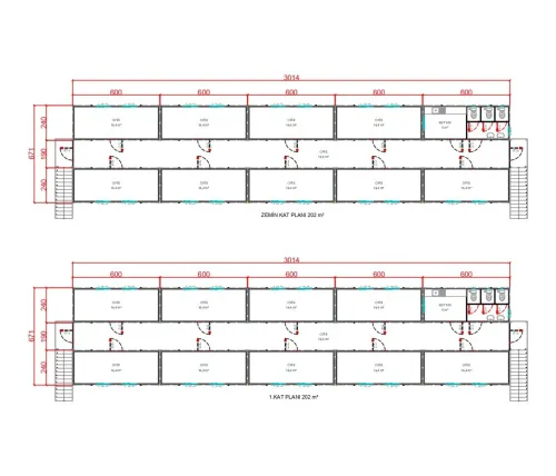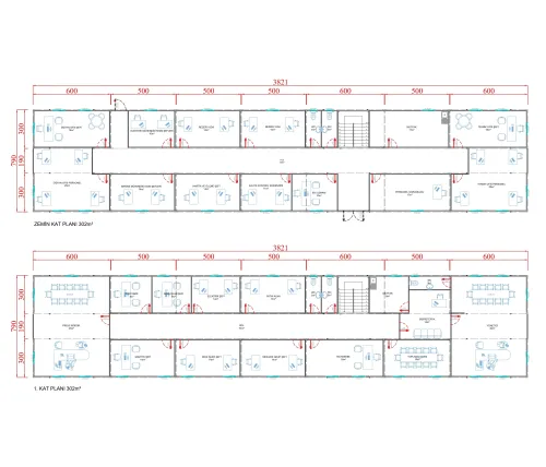 604 m² çok katlı konteyner ofis, yüksek personel yoğunluğuna sahip projelerde operasyonel süreçleri merkezi bir noktadan yönetmek için uygundur. Katlı yapıda düzenlenmiş ofisler; yönetim odaları, sosyal alanlar, mutfak ve WC üniteleriyle donatılarak eksiksiz bir kullanım imkânı sunar. Yüksek mukavemetli taşıyıcı sistemi, uzun ömürlü panel yapısı ve dört mevsime uygun yalıtımıyla bu binalar, kalıcı nitelikteki sahalar için tercih edilir.
