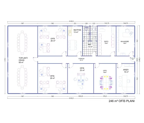 246 m² alana sahip bu yapı, belediyeler, kamu kurumları veya büyük ölçekli firmaların ihtiyaçlarını karşılamak üzere tasarlanmıştır. Fonksiyonel yerleşim planı, enerji verimliliği ve dayanıklı malzeme kullanımıyla uzun ömürlü bir idari merkez çözümüdür.